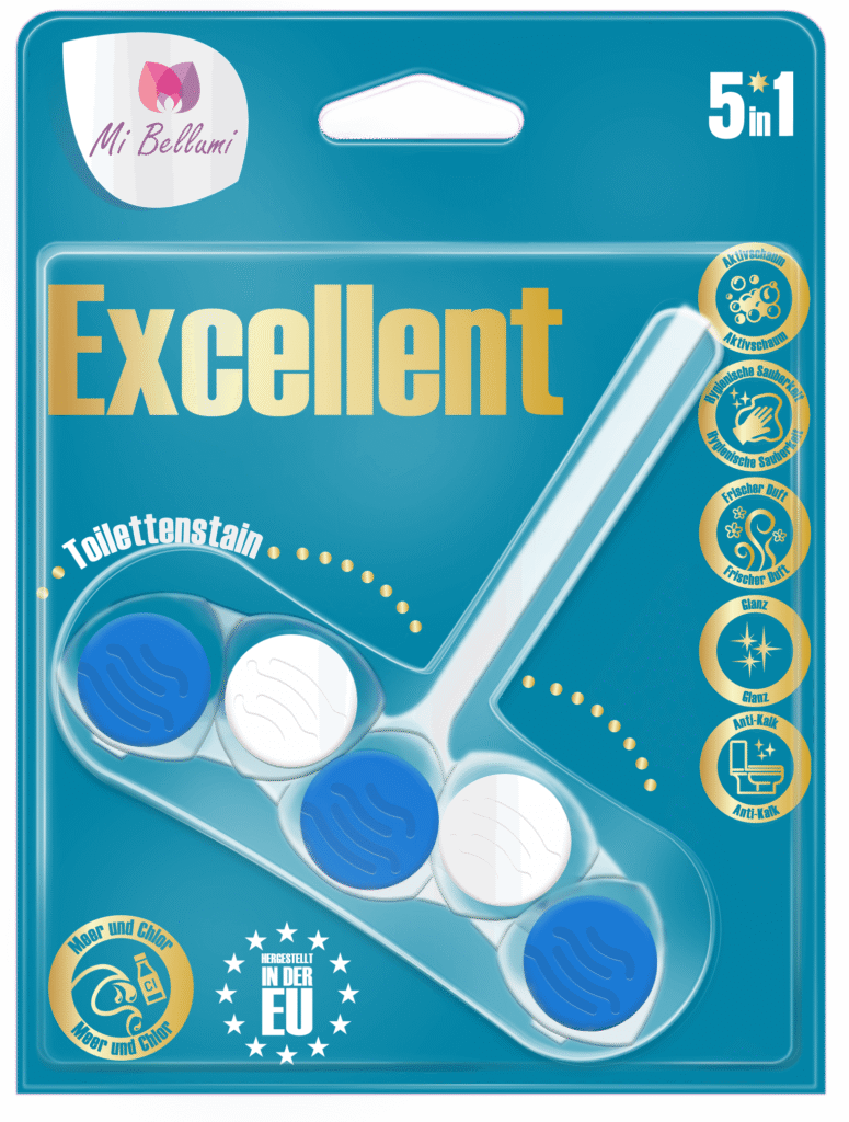 Вони ефективно очищають, дезінфікують і надають приємний аромат, забезпечуючи ефект 5 в 1: захист від вапняного нальоту, гігієнічну чистоту, блиск, свіжий аромат та активну піну. Завдяки вмісту хлору ефективно захищають унітаз від вапняного нальоту та відкладень. Доступні в упаковках по 3 або 5 таблеток.